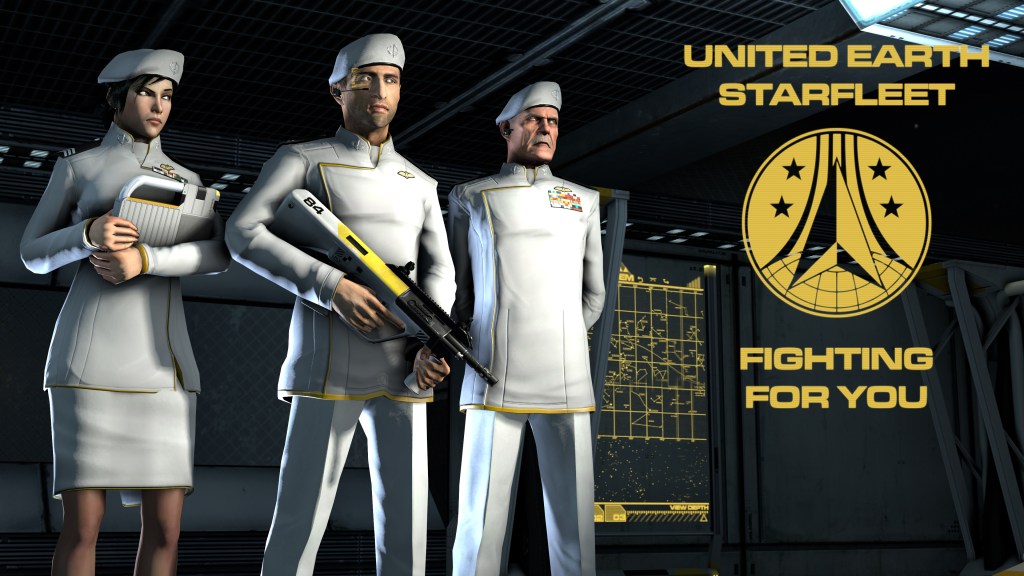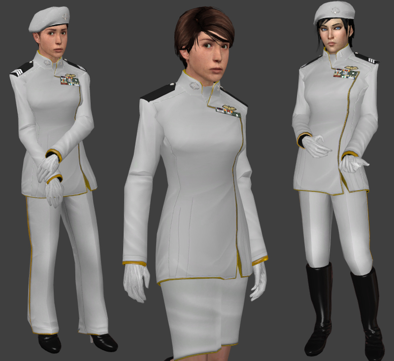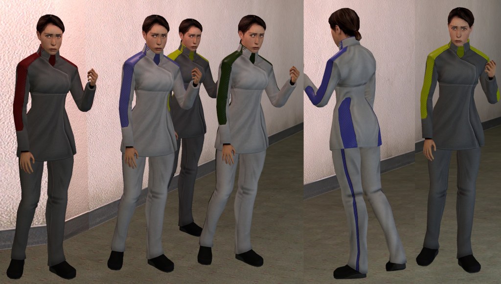 Given my newly developing texturing skill, I decided that it wouldn’t be a bad idea to make a generic looking science fiction outfit. The color schemes and cloth patterns were designed to just look spacey. I’ve had a lot of people come out and say that it looks a lot like uniform X from show Y, but really, I just copied the general tropes. I recycled resources from other projects; generic military badges, ribbons I had made up, shoes I had edited for Star Trek outfits. I created and released the entire pack of hexed males in under 3 days, complete with normalmaps and phong.