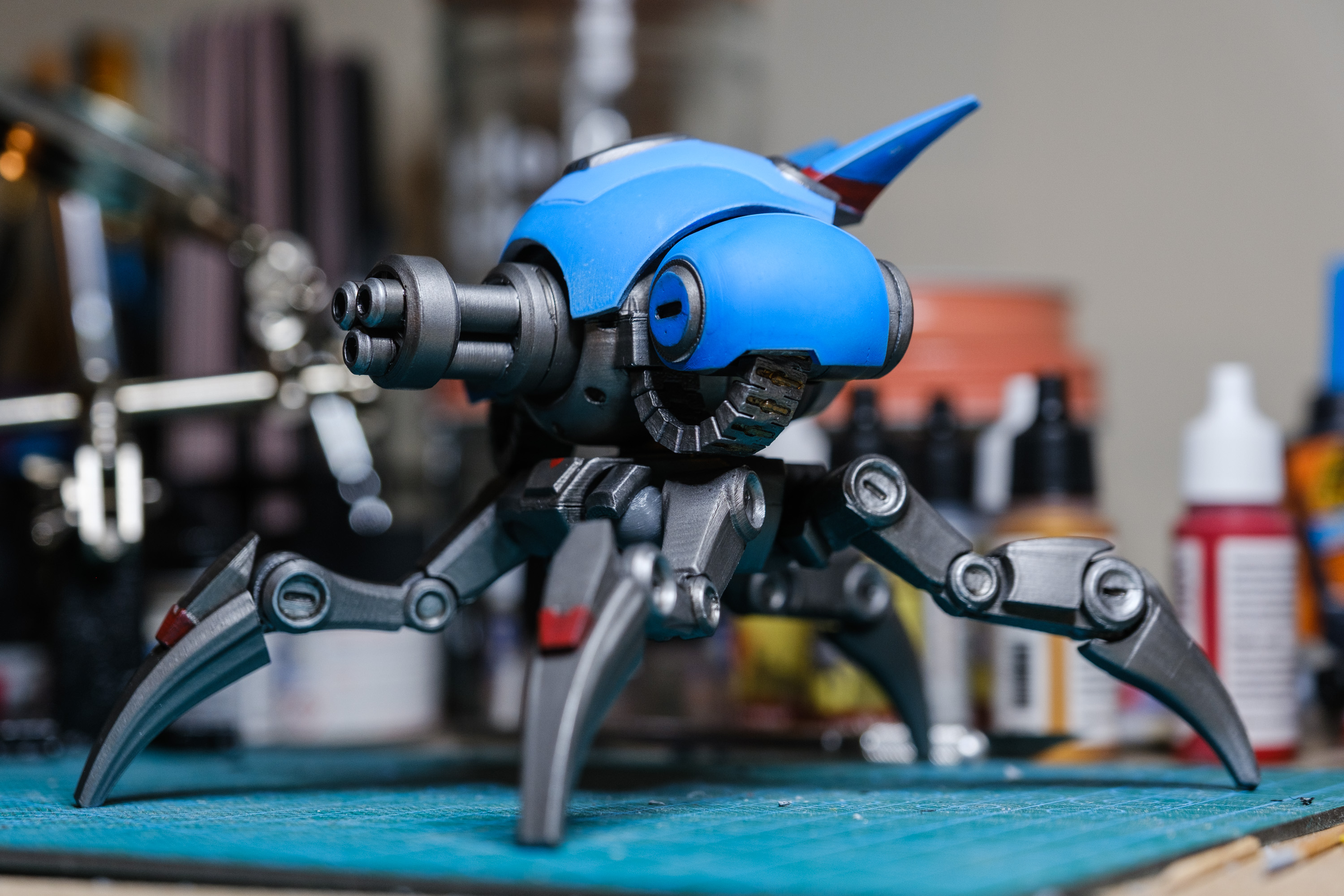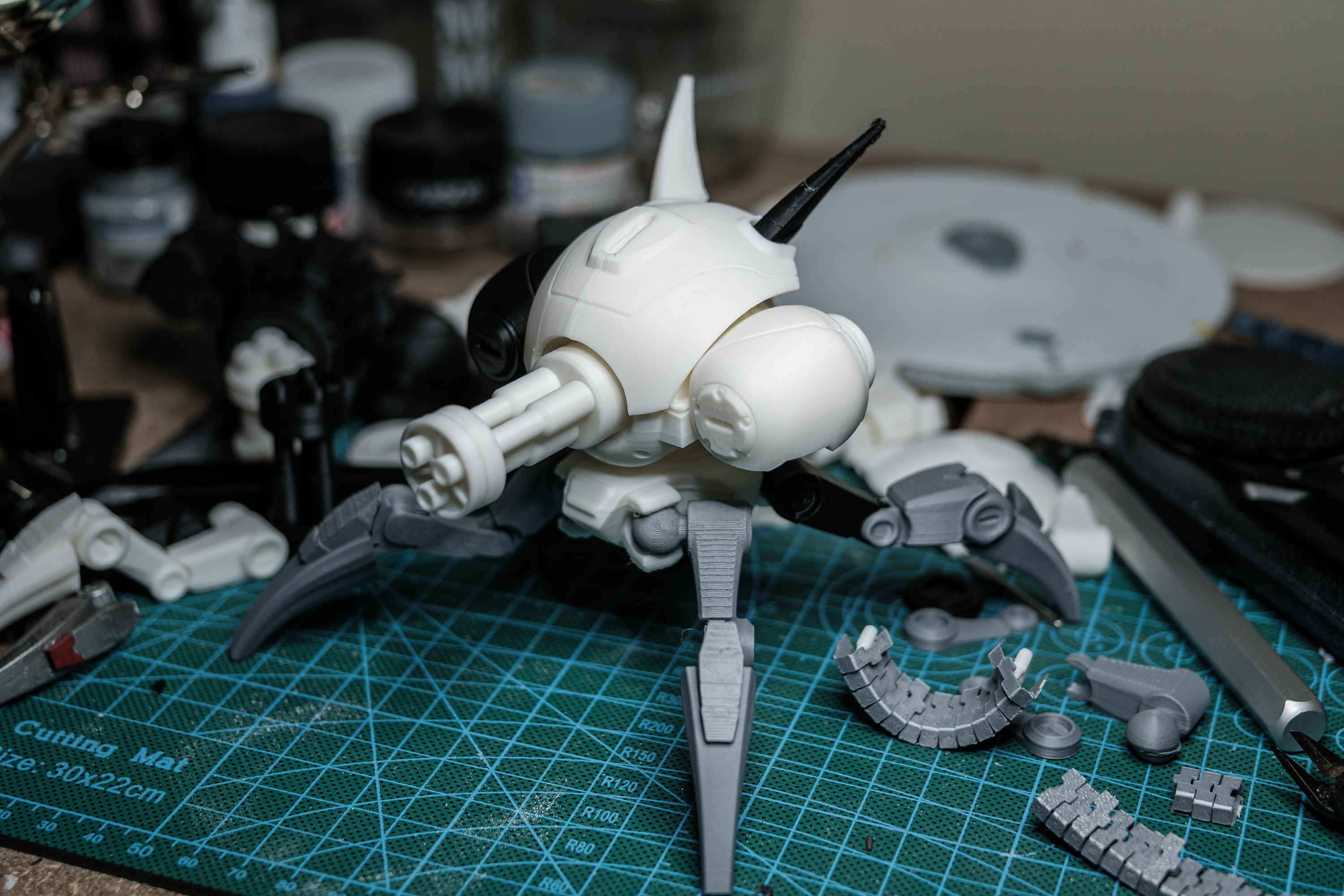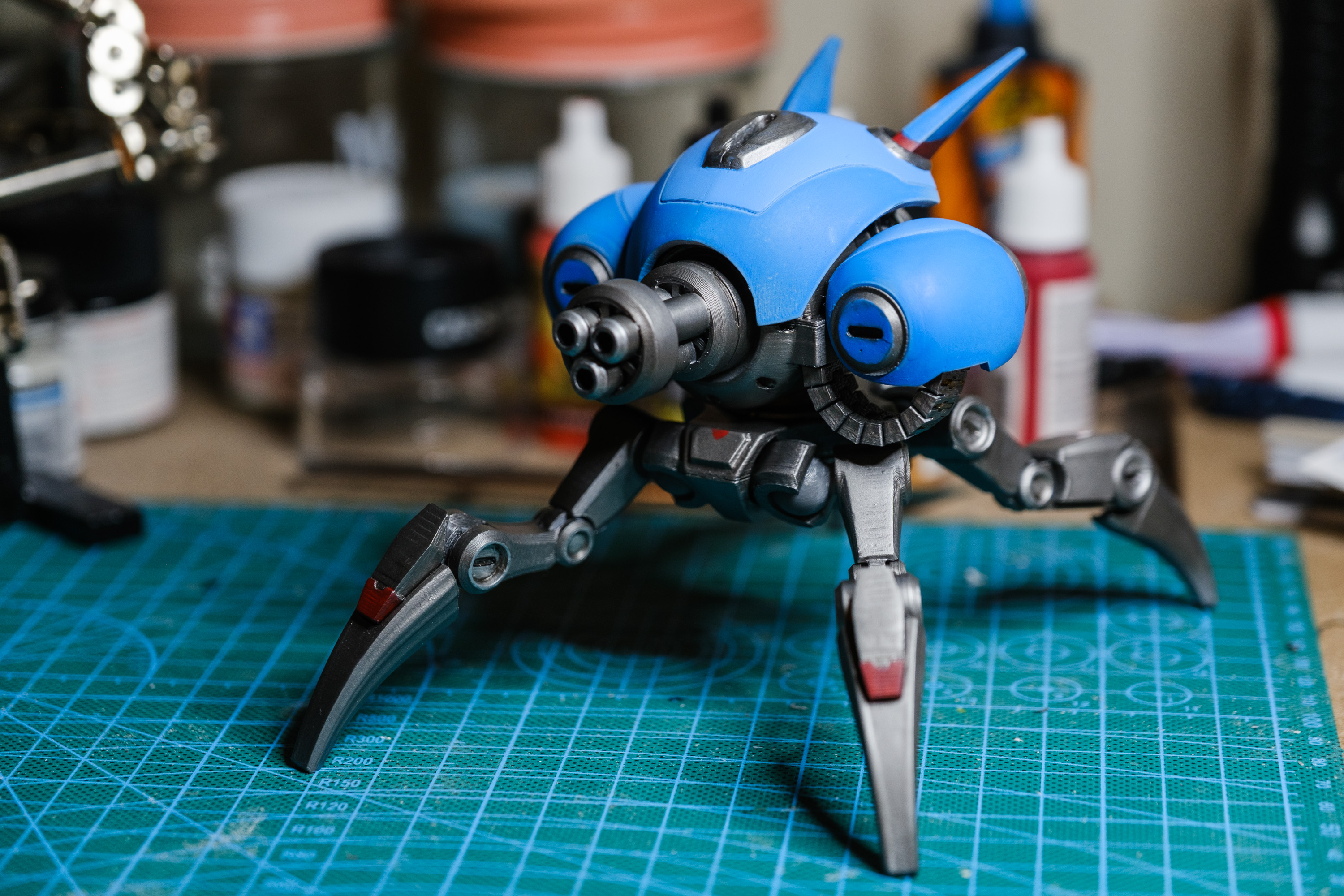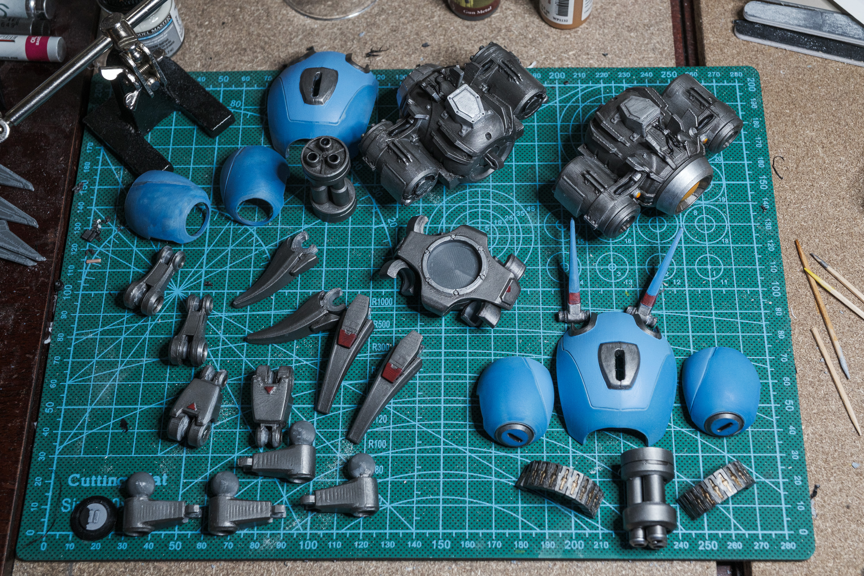 Once the dust had settled, I had one painted Gunbot and an assembly line of primed, half painted, partially sanded, and printed parts for two more.