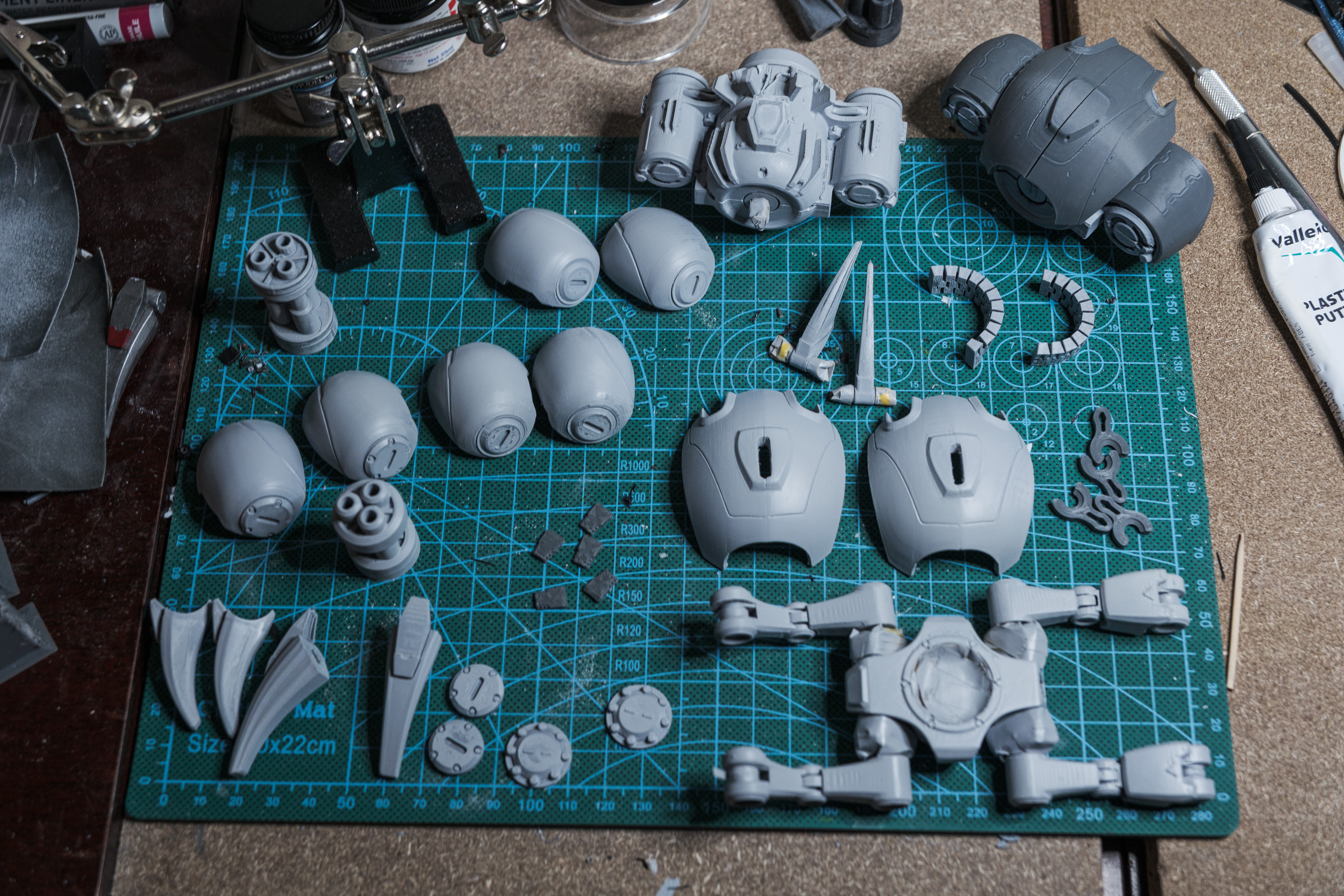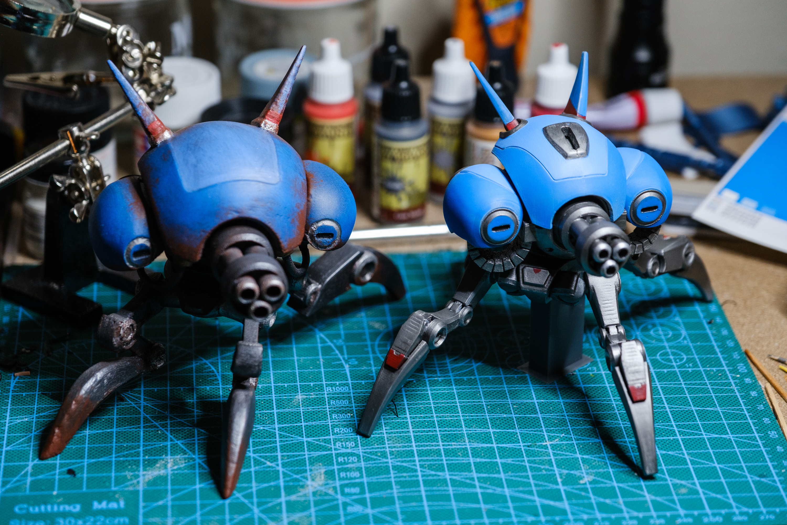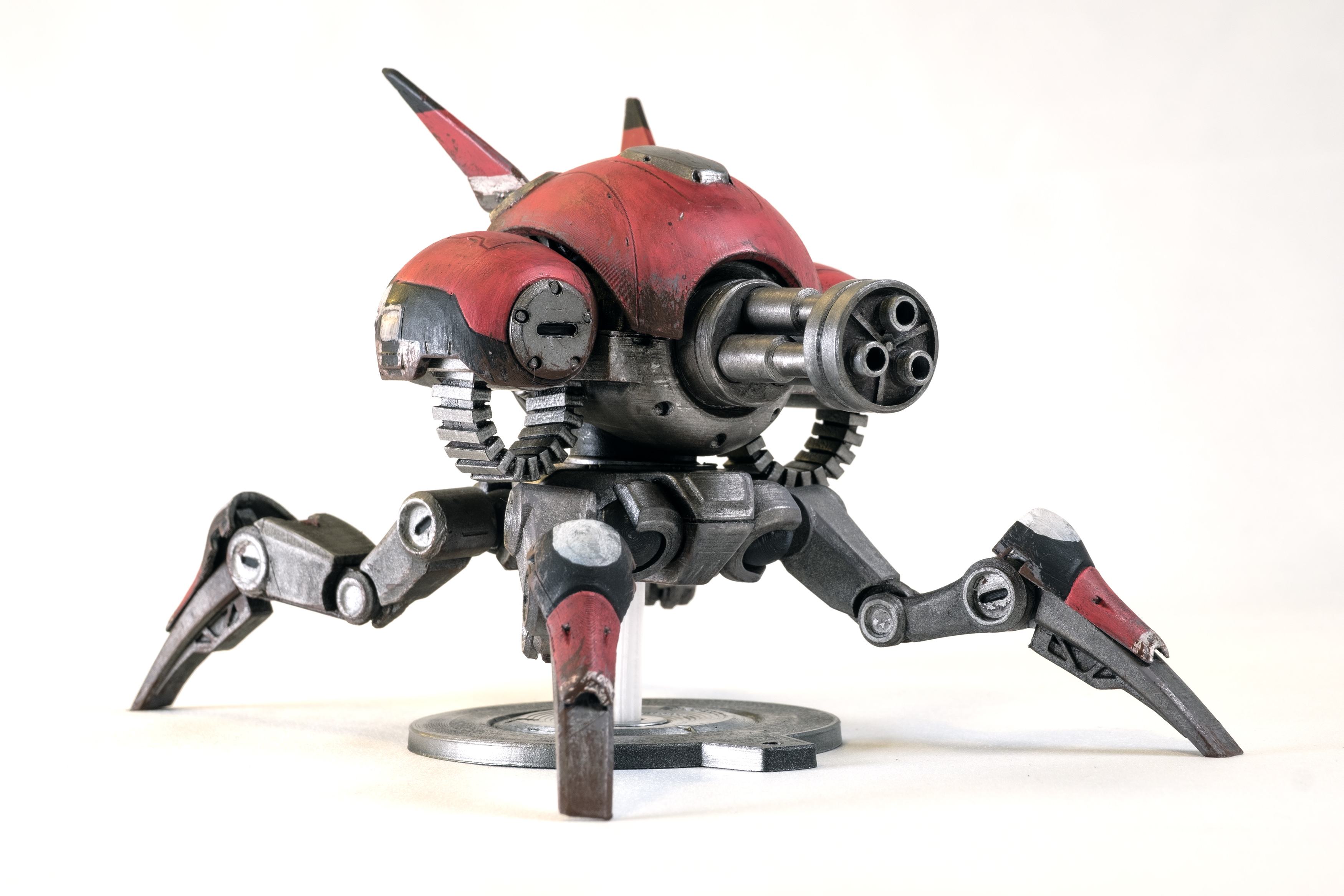Once the dust had settled, I had one painted Gunbot and an assembly line of primed, half painted, partially sanded, and printed parts for two more.