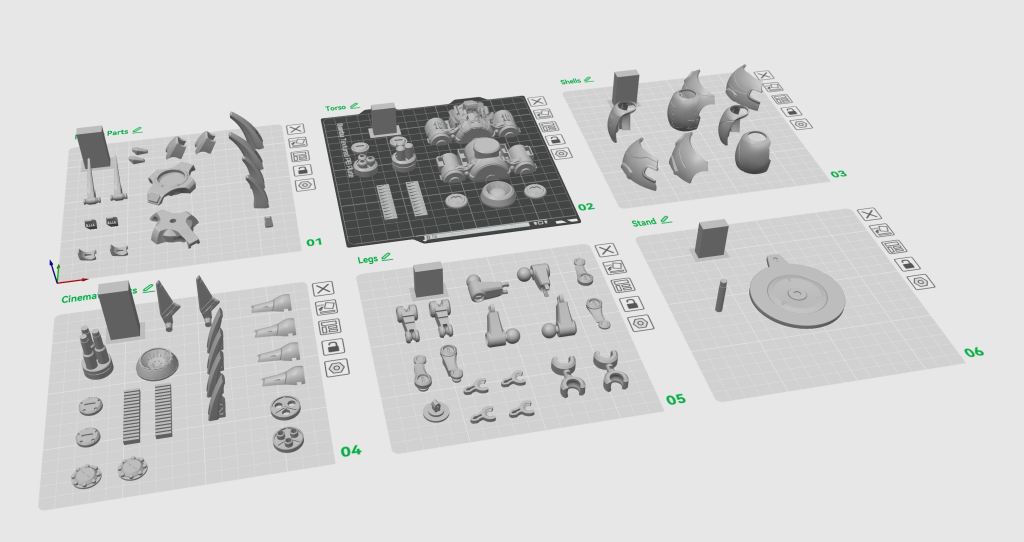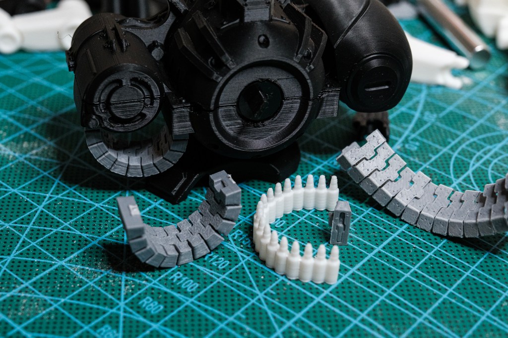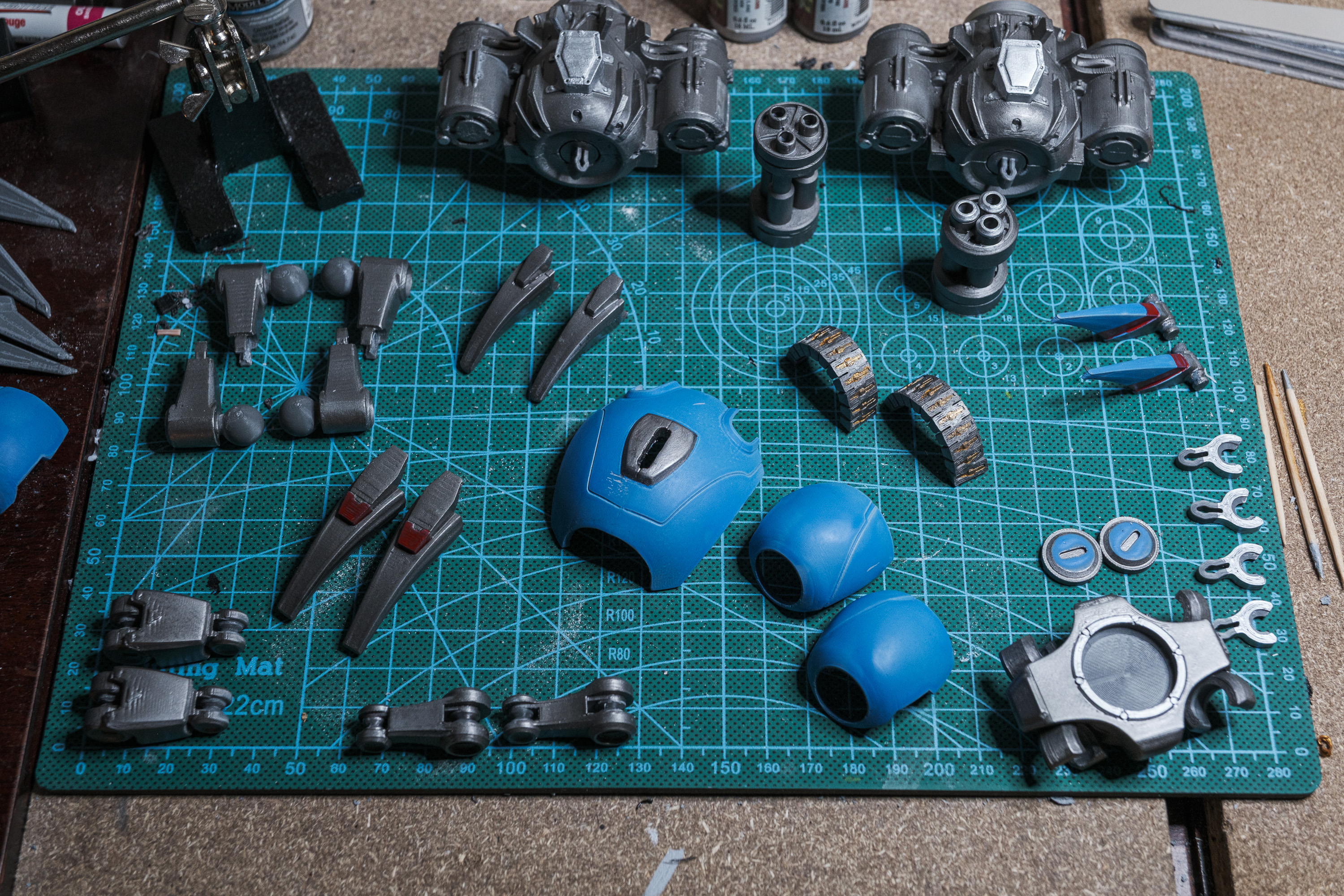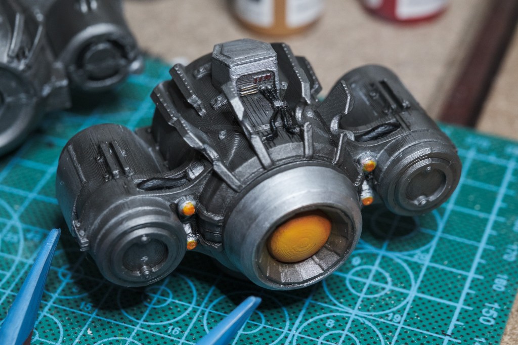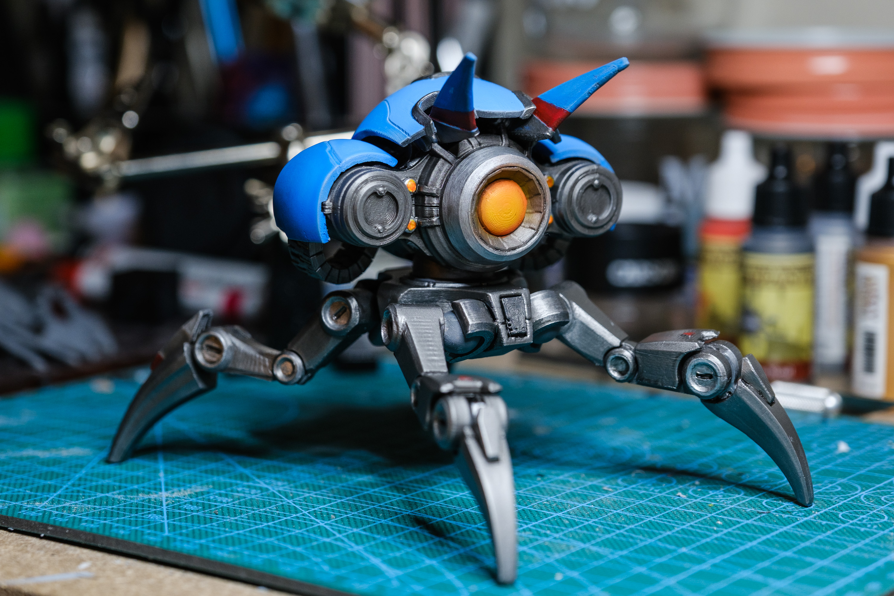 Once the dust had settled, I had one painted Gunbot and an assembly line of primed, half painted, partially sanded, and printed parts for two more.