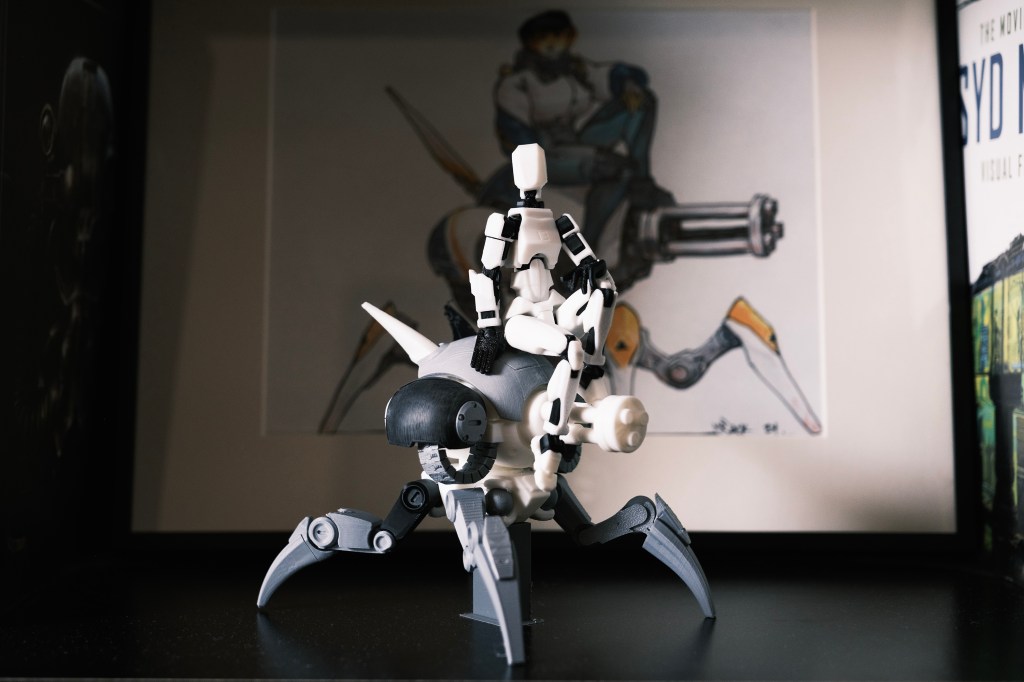 The ball joints also were prone to slipping if left unpainted, and often printed poorly. I ultimately designed a stand for the model to guarantee it’d survive long term under its own weight, but it felt like a step back from the first version.