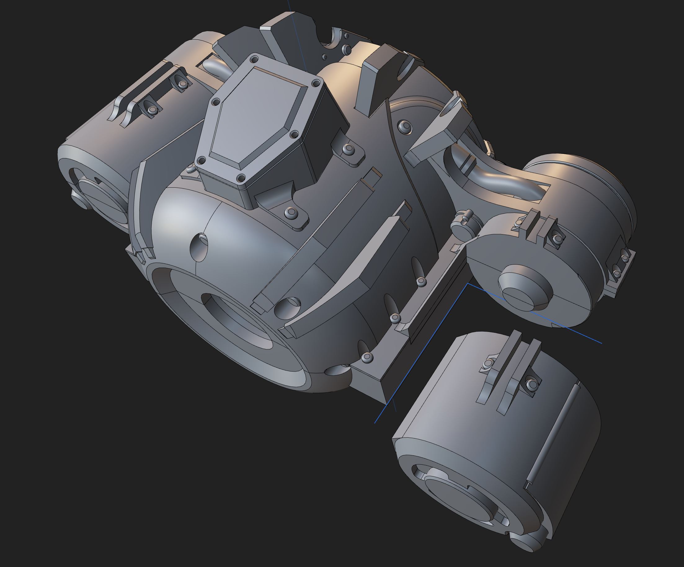 Finally having broken past the bedrock, I was in the flow zone, that mythical part of a project where it’s really fun to work on. I decided to go all in on trying to merge together the ingame and cinematic design motifs while making changes necessary for it to be printable. This became in interesting dance of finding seam and cut lines, and defining end caps and alternate parts that the model builder could mix and match between to make their ideal design from.