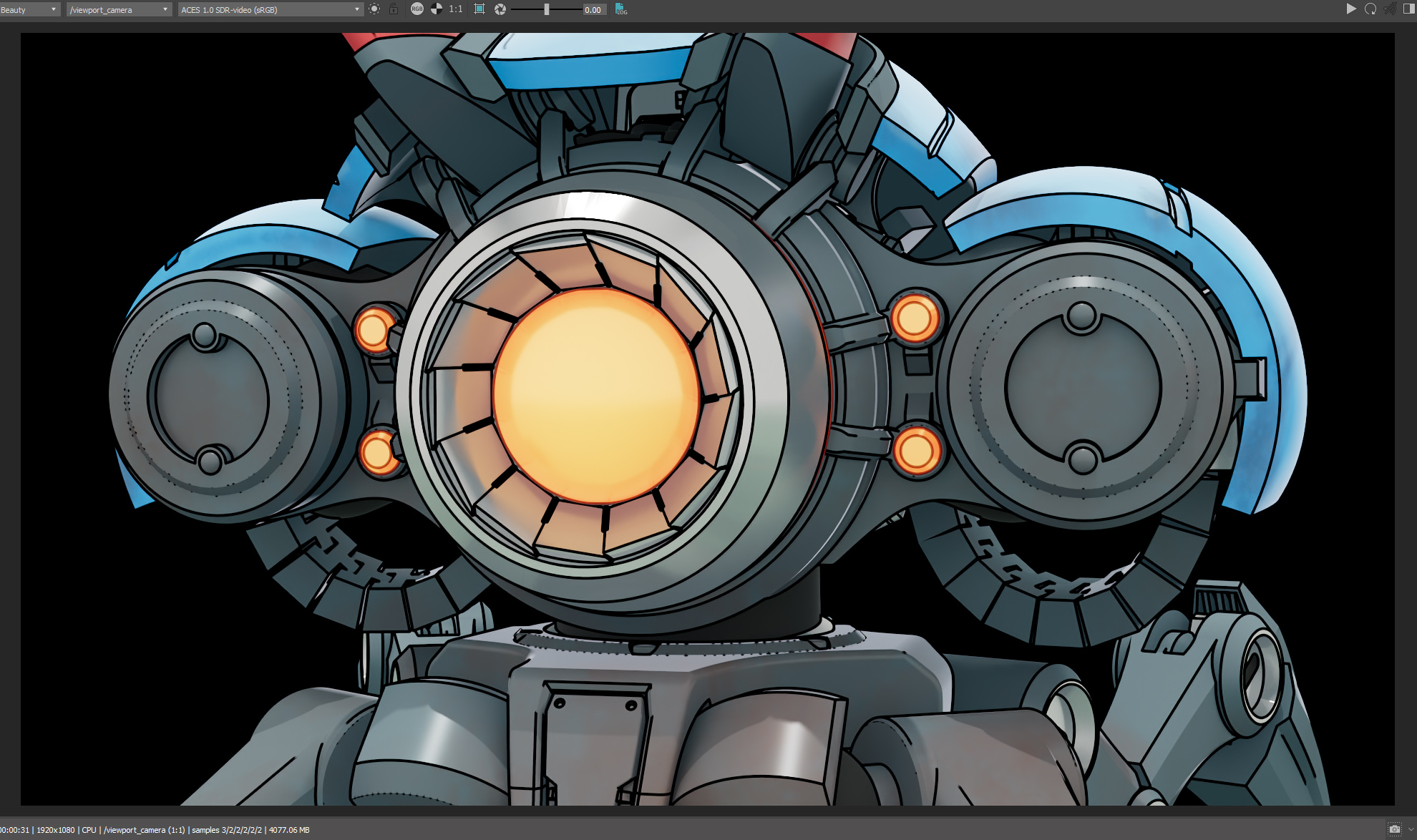 While not necessary, I did explore the shader’s capabilities and wired up a glow effect for the thruster. Since Arnold is all raytraced and stuff, the chrome finish catches the light and it emisses onto nearly surfaces. I was even able to change the color of the edge lines to a dark red to imply even more heat – pretty cool stuff.